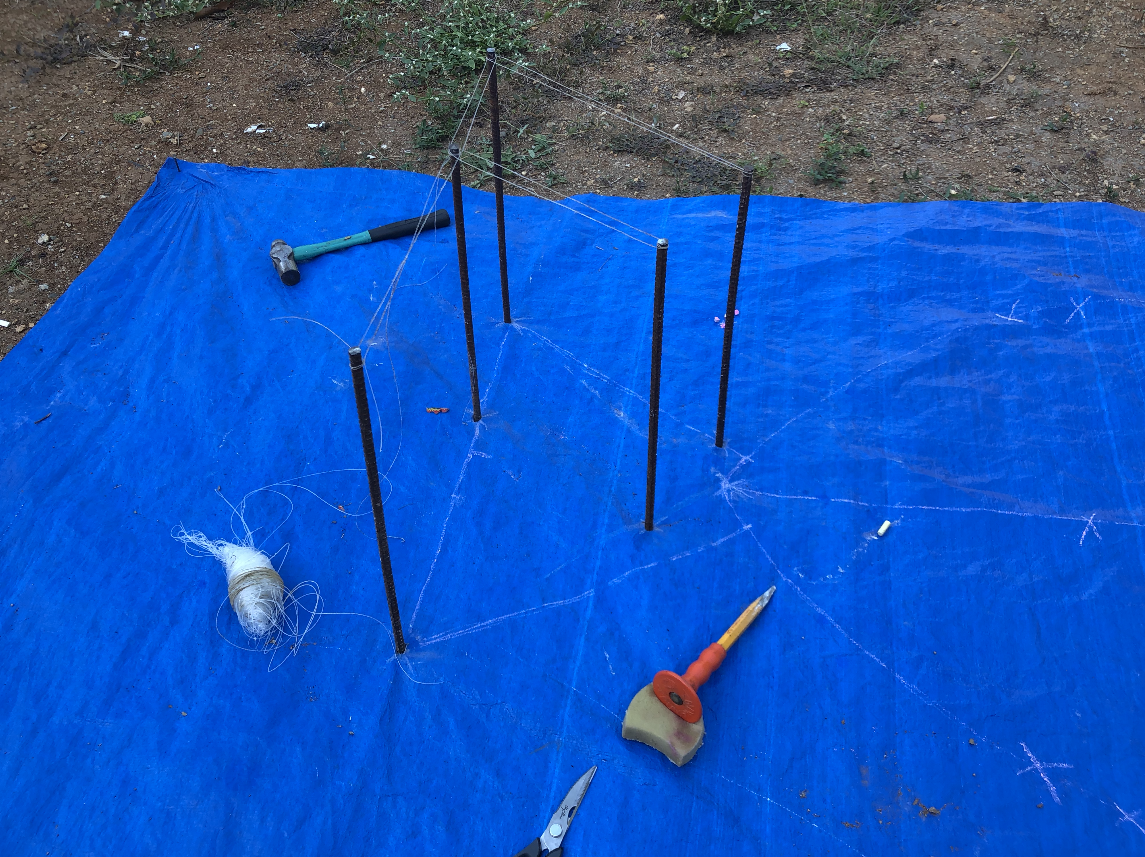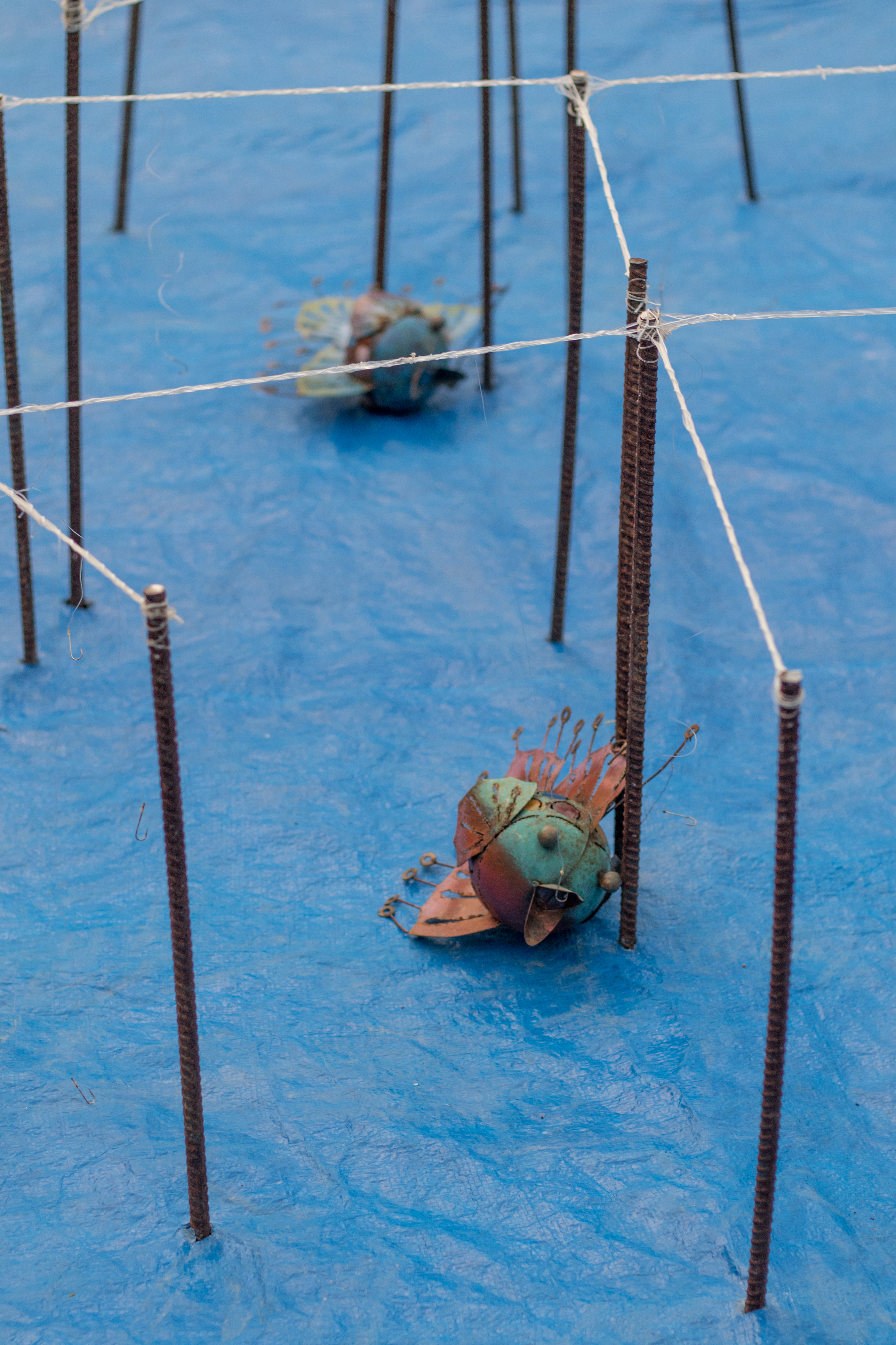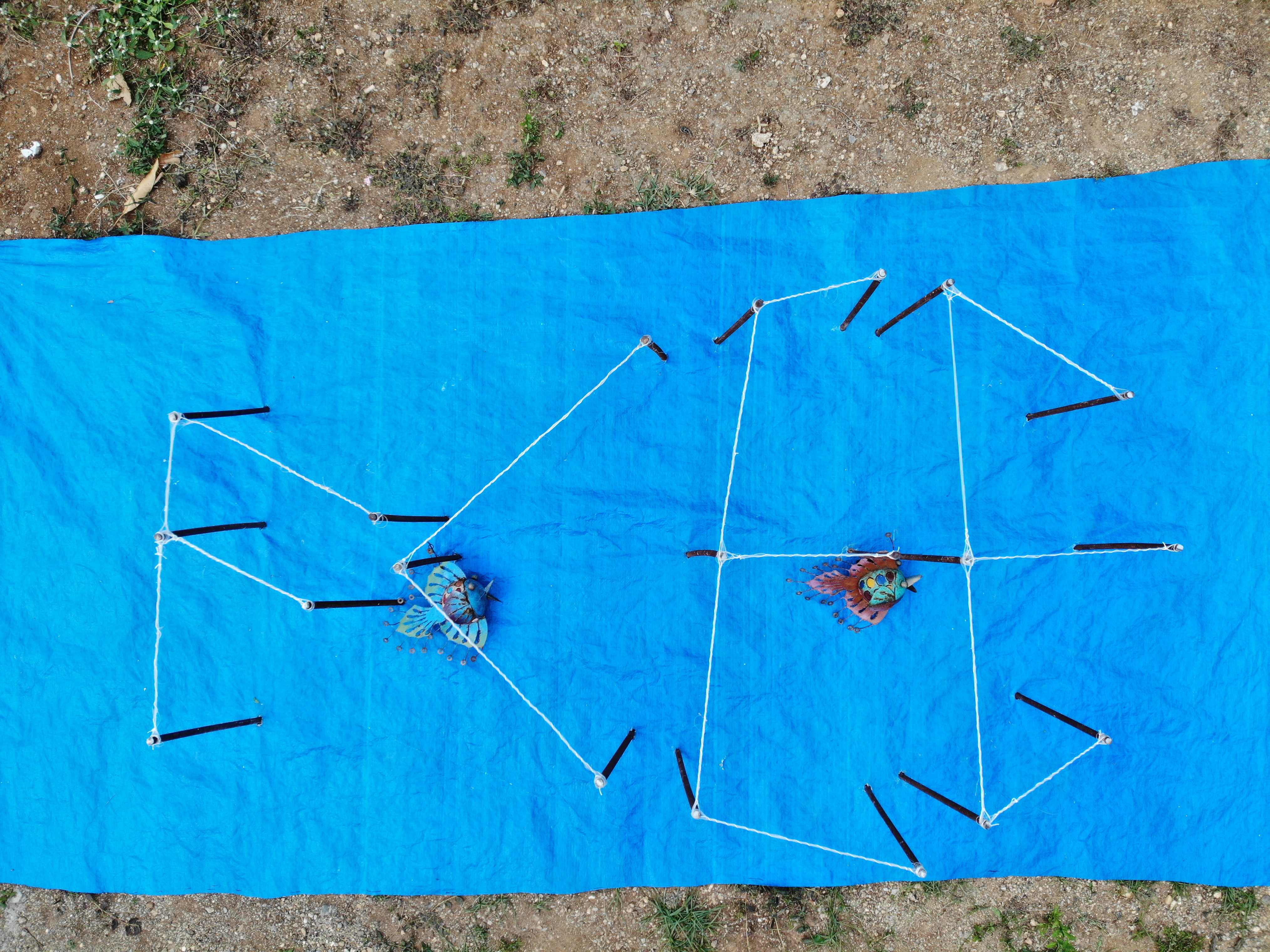 For this project, I am only using scrap: metal rods left around the property (to shape the typography and ultimately the fish), the fishing nets I retrieved from my dive (to put around the metal rods), a tarp left in a corner (to represent the ocean as I am unable to do this in the sea). My initial idea was to use plastic bottles instead of the metal rods, which would float on the ocean, & the bird (the drone) would then be relaxing on the water, before flying off.