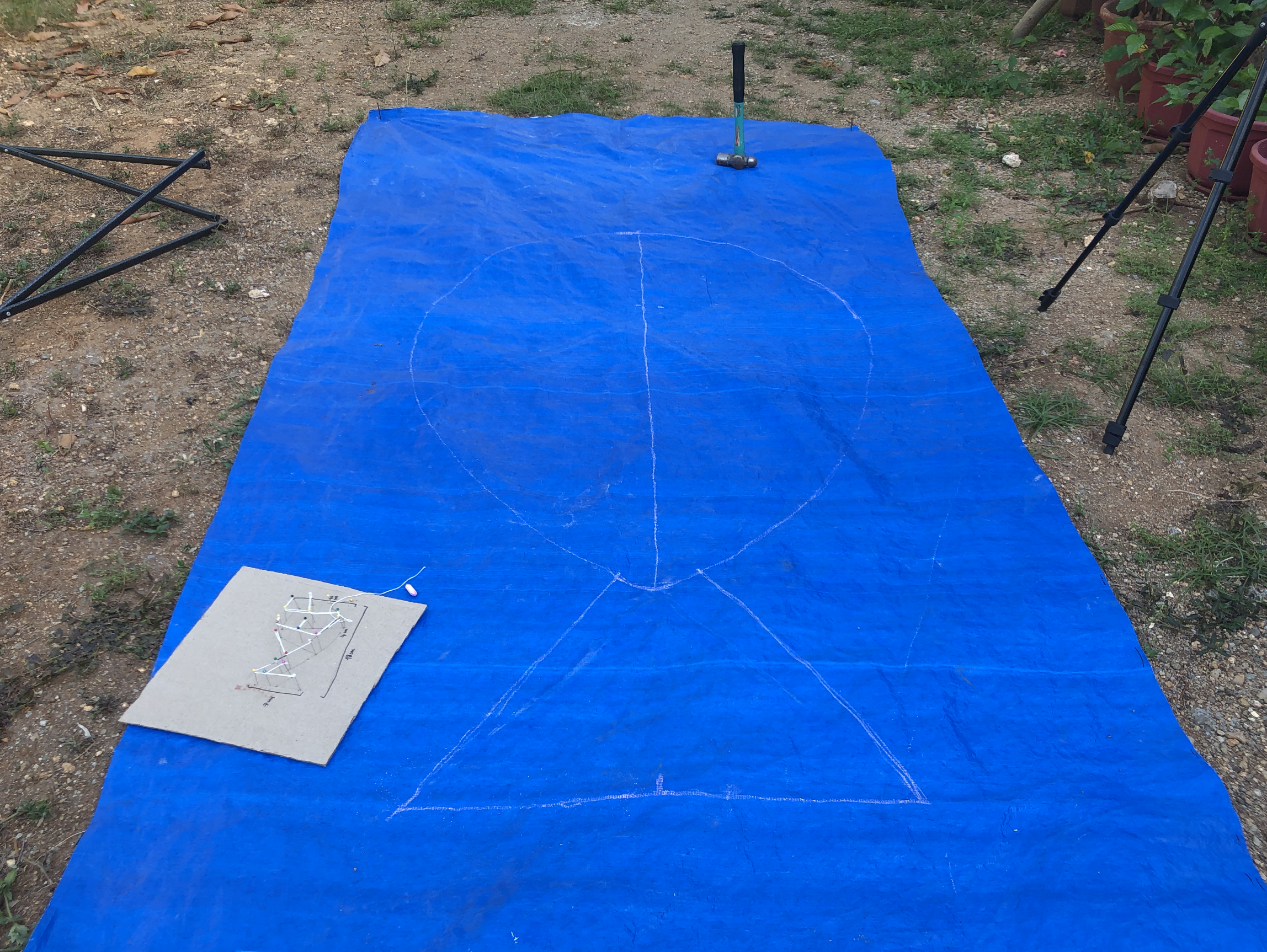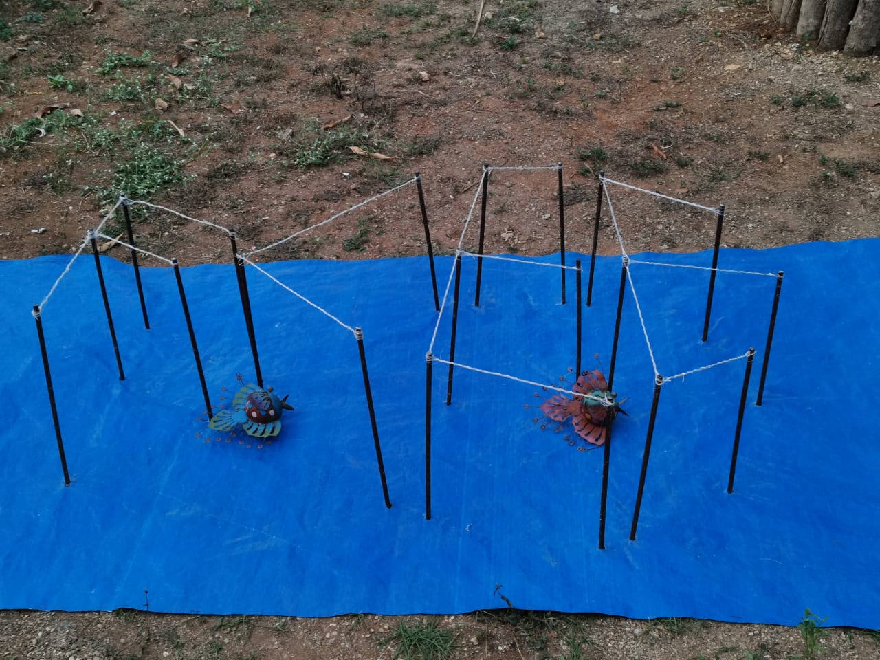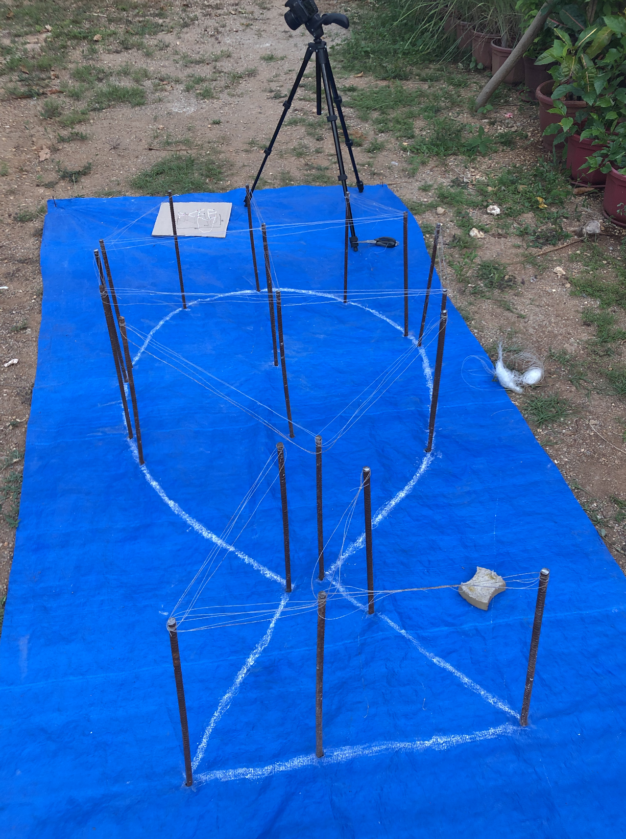 For this project, I am only using scrap: metal rods left around the property (to shape the typography and ultimately the fish), the fishing nets I retrieved from my dive (to put around the metal rods), a tarp left in a corner (to represent the ocean as I am unable to do this in the sea). My initial idea was to use plastic bottles instead of the metal rods, which would float on the ocean, & the bird (the drone) would then be relaxing on the water, before flying off.