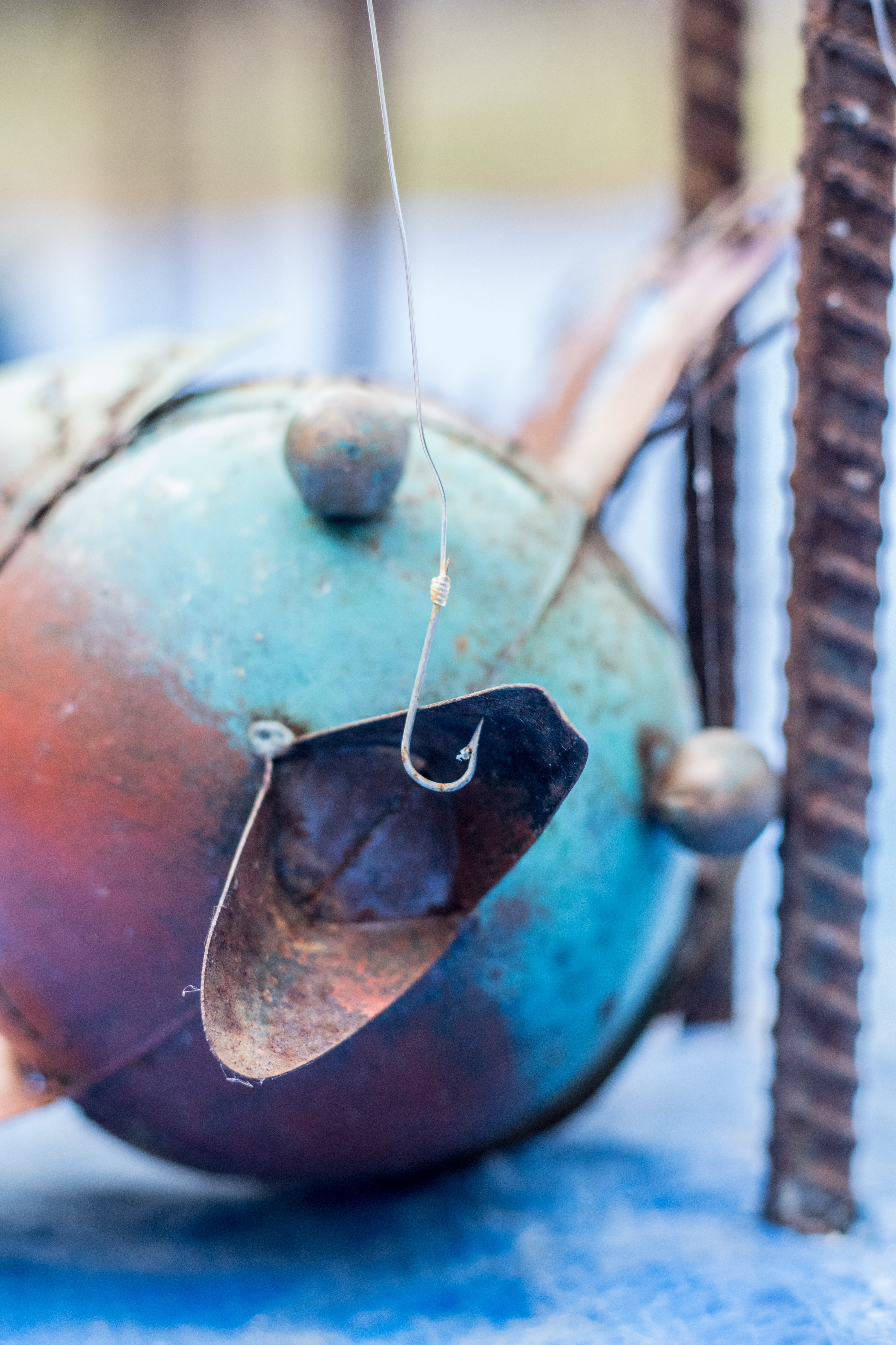 I was really unhappy with the above outcome. The letters were not readable @ all, & so the next day I decided to add even more fishing nets, & to tie them together with white string. The outcome was much more readable. Then, I decided to add some fish my parents had laying around in the garden, & put the hooks in their mouth to better represent the illegal fishing & then fish that died for no reason.